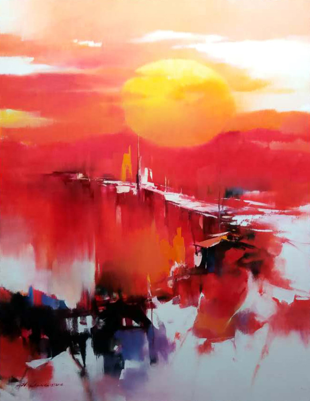 红曰码头, 布上油画, 以半抽象写法描繪, 用色大胆创新
